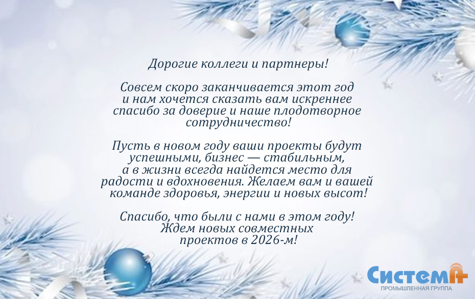 Пусть в новом году ваши проекты будут успешными, бизнес — стабильным, а в жизни всегда найдется место для радости и вдохновения. Желаем вам и вашей команде здоровья, энергии и новых высот!